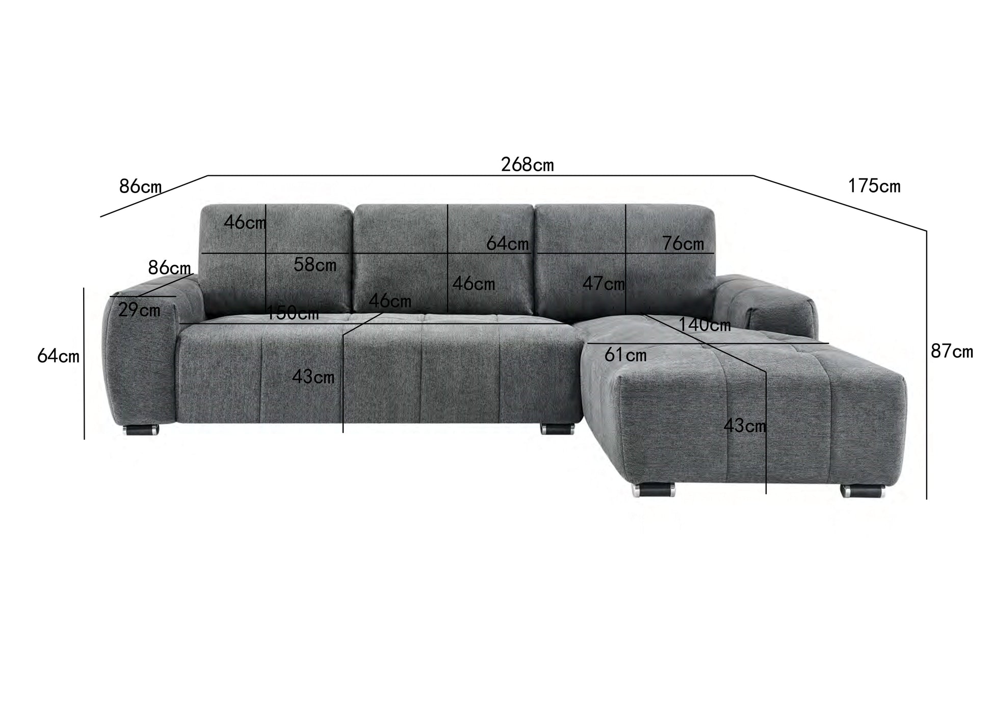 Upholstered in luxurious fabric, available in three versatile colors — Silver, Beige, and Grey — the Caramel easily complements a wide range of interiors, from minimalist to classic. The right-hand corner configuration is ideal for cozy lounging and optimal use of space, especially in apartments or contemporary homes.